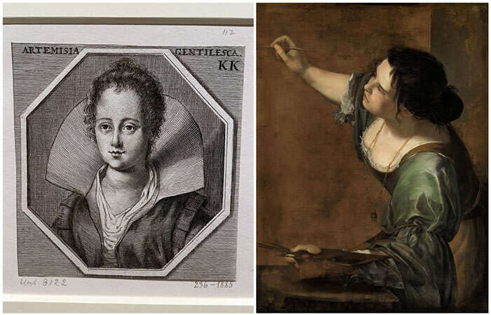 左图:“真蒂莱斯基肖像”,德国巴洛克艺术史学家和画家桑德拉特(Joachim von Sandrart,1606-1688),1675;右图*:“自画像”(Self-Portrait as the Allegory of Painting),阿尔泰米西娅·真蒂莱斯基(Artemisia Gentileschi,1593-1654或更晚),1638-1639,英国王室皇家收藏藏品(Royal Collection)