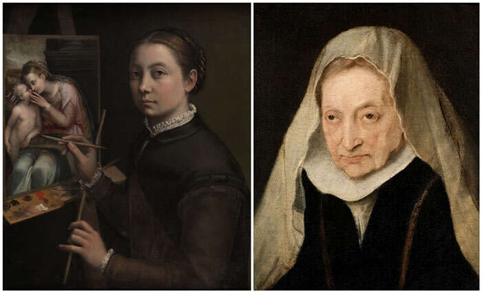 左图*:“自画像”,索福尼斯巴•安圭索拉,1556,波兰万楚特城堡博物馆馆藏(Łańcut Castle / Muzeum – Zamek w Łańcucie);右图*:“索福尼斯巴肖像”,安东尼·凡·戴克(Anthony van Dyck,1599-1641),1624,英国国民信托藏品 (National Trust)