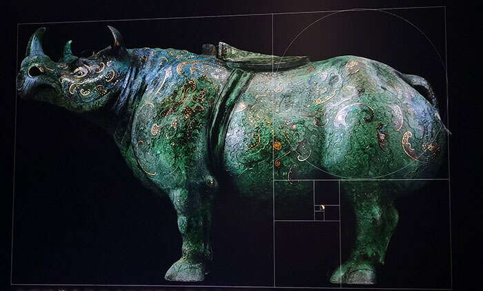 工匠通过结构弧线对犀牛的某些部位进行几何抽象和提炼,并以简洁的笔触打破了料珠的一团漆黑。同时,犀尊头部微微向左前方扬起,这一变化打破了对称所带来的呆板和僵化,而这一设计也同时满足了犀尊右颊部安插流管的功能需要,使器物倒酒的功能与动物特有的生命力的体现得到了巧妙的统一。研究人员将其放入数学模型中,发现犀尊多处尺寸比例符合黄金分割比例,而犀尊造型的曲线和轮廓走向亦有其内在的数学逻辑,符合斐波那契螺旋线系统,这也在一定程度上揭示了犀尊各个角度均具有美感的原因。