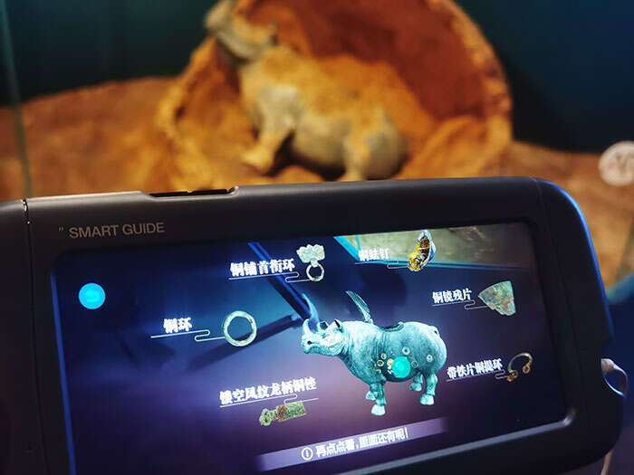 图为智能导览机屏幕上的显示内容,观众可以点击扫描展柜内犀尊发掘时的还原场景,看到犀尊腹内的17件其他器物介绍。