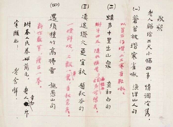 在本次展览中,北京画院藏《南昌馆七夕连句》小楷,上书有齐白石所作南昌联句“久坐生微凉,竹簟清露滋”,应该是王湘绮事后所誊写,印证了师徒之间这件耐人寻味的趣事。齐白石经营诗学可谓是不遗余力,不仅向老师等求学诗法、与朋友切磋诗艺,还请晚清诗人樊增祥为其诗稿润色,积极策划出版诗集。1917年,樊樊山为齐白石《借山吟馆诗草》作序:“凡此等诗,看似寻常,皆从刿心鉥肝而出,意中有意,味外有味”,言语间皆是赞美之词。而展览中的《谢齐山人赠鹅茸被歌》,亦为两人二人感情深厚的见证。此外,展览呈现了齐白石与陈师曾、陈半丁、于右任、罗惇曧等20世纪中国文坛艺界名家艺事交流、往还赠赋的书画文献,讲述了齐白石与师友之间的浓浓情谊。观者亦可透过多元视角,在篇篇诗文构筑的群像中还原更为立体的齐白石。