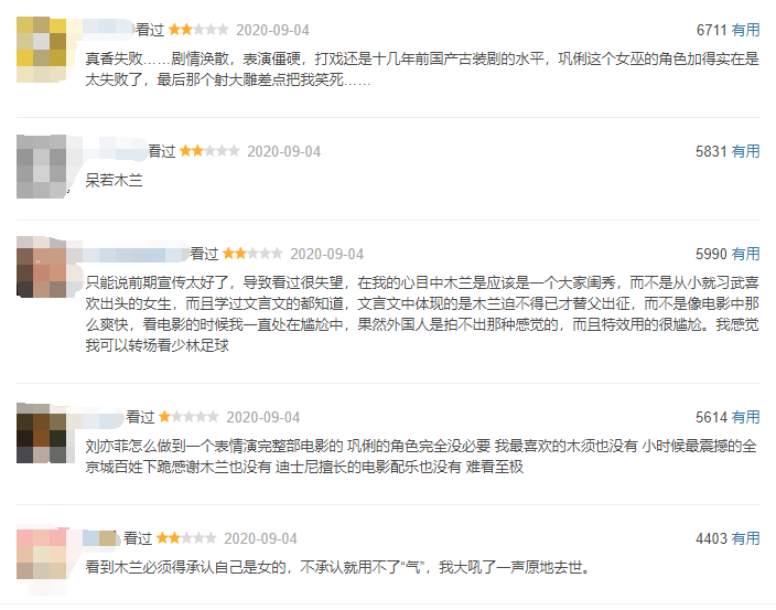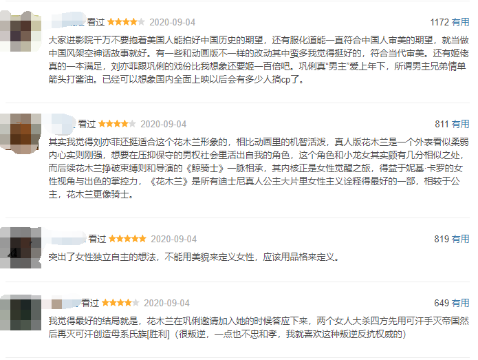 不过电影《花木兰》的评价成两极化,有评论非常好看的,突出了女性独立自主的想法。