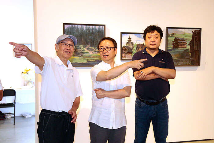 中国油画院副院长朱春林(中)参观展览(摄影 冯世光)