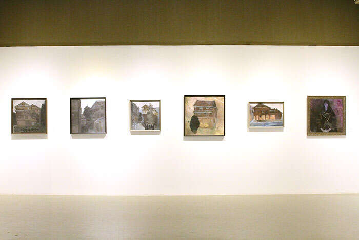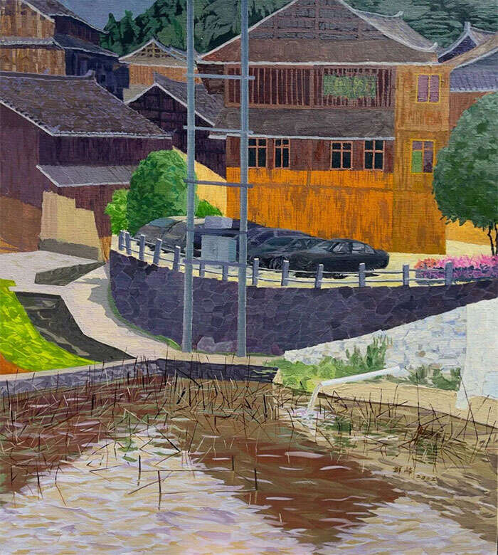 同为展览学术主持的油画家秦烨教授是此次写生活动的主要召集人,秦烨于今年2月和4月曾两次到访侗寨。从他的作品中能够明显感知到侗寨在两种季节气候下的风貌差异。“今年2月份,我与几位艺术家第一次来到广西三江,我们去的时候第一感觉是冷,这里白天最高气温只有五六度,每天都是阴沉沉黑乎乎的,所以那时画出来的画没有太多色彩,整体色调也偏阴沉阴郁。后来到4月份初春时我们又去了一次,这次的感觉是春天的绿意明显多了一些,但天气还是很冷,时常下雨。侗寨有一种神秘的特质非常触动和吸引我。可能因为气候的缘故,那里的房子因为经年累月的潮湿多数都会变黑,再加上当地人在建筑的外立面也会刷黑漆,更平添了一种神秘感和分量感。那些建筑和房屋,高低错落着,你能品味到一种节奏的韵律感,这都是我在绘画中关注和表达的,一是流动变化的节奏韵律,二是色彩的浓重感与分量感。”秦烨说到。