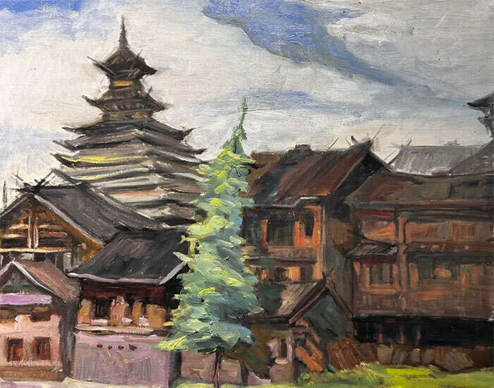 曹星原,《侗寨鼓楼》,50x40cm,2023年