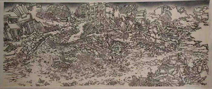 雷绍文,《灾难图》,水墨绢本,141×338.5 cm,2016