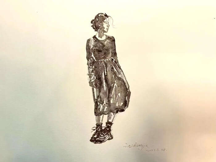 聂正杰,《南京东路打卡》,纸本水彩、矿物质颜料,31×41 cm,2023