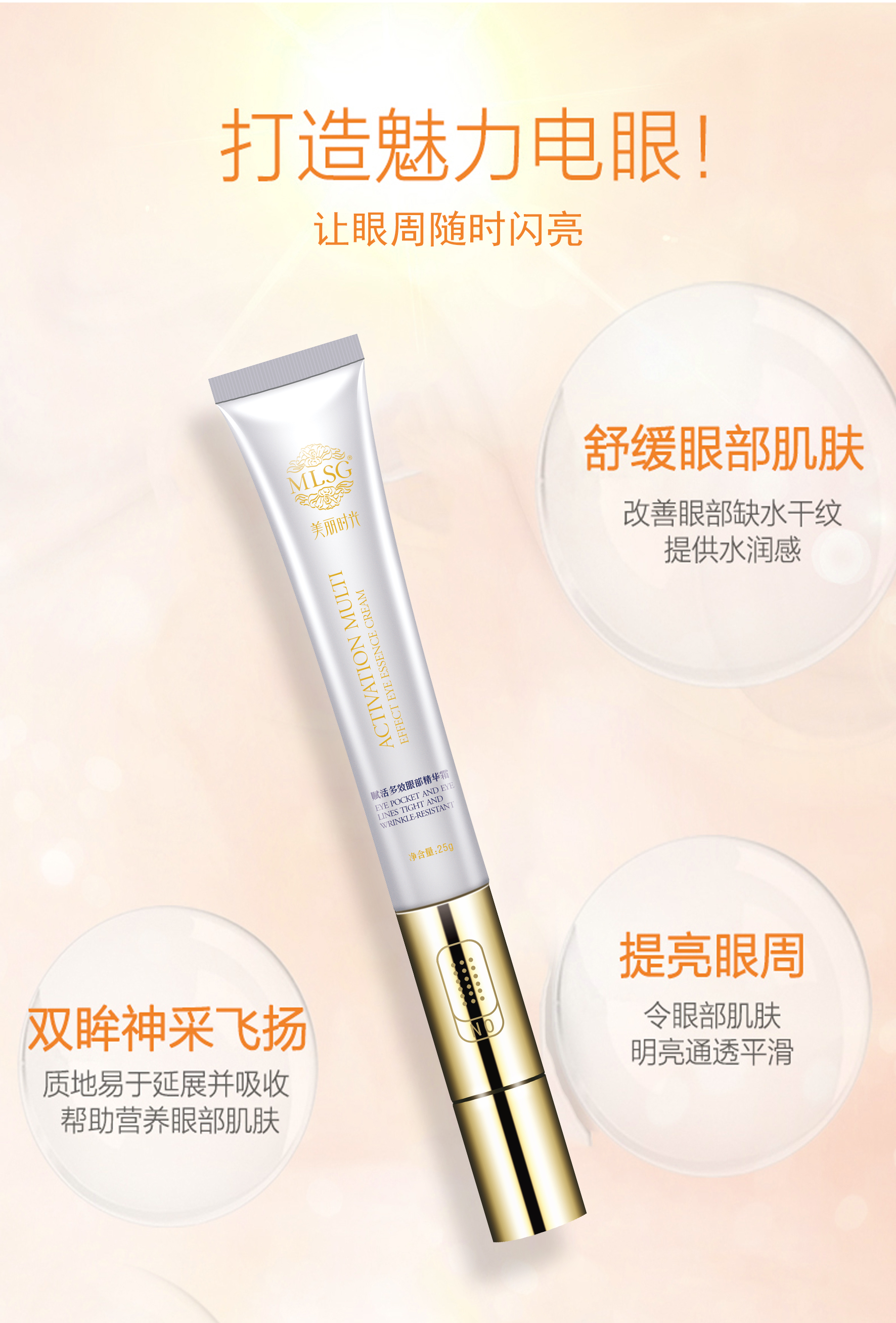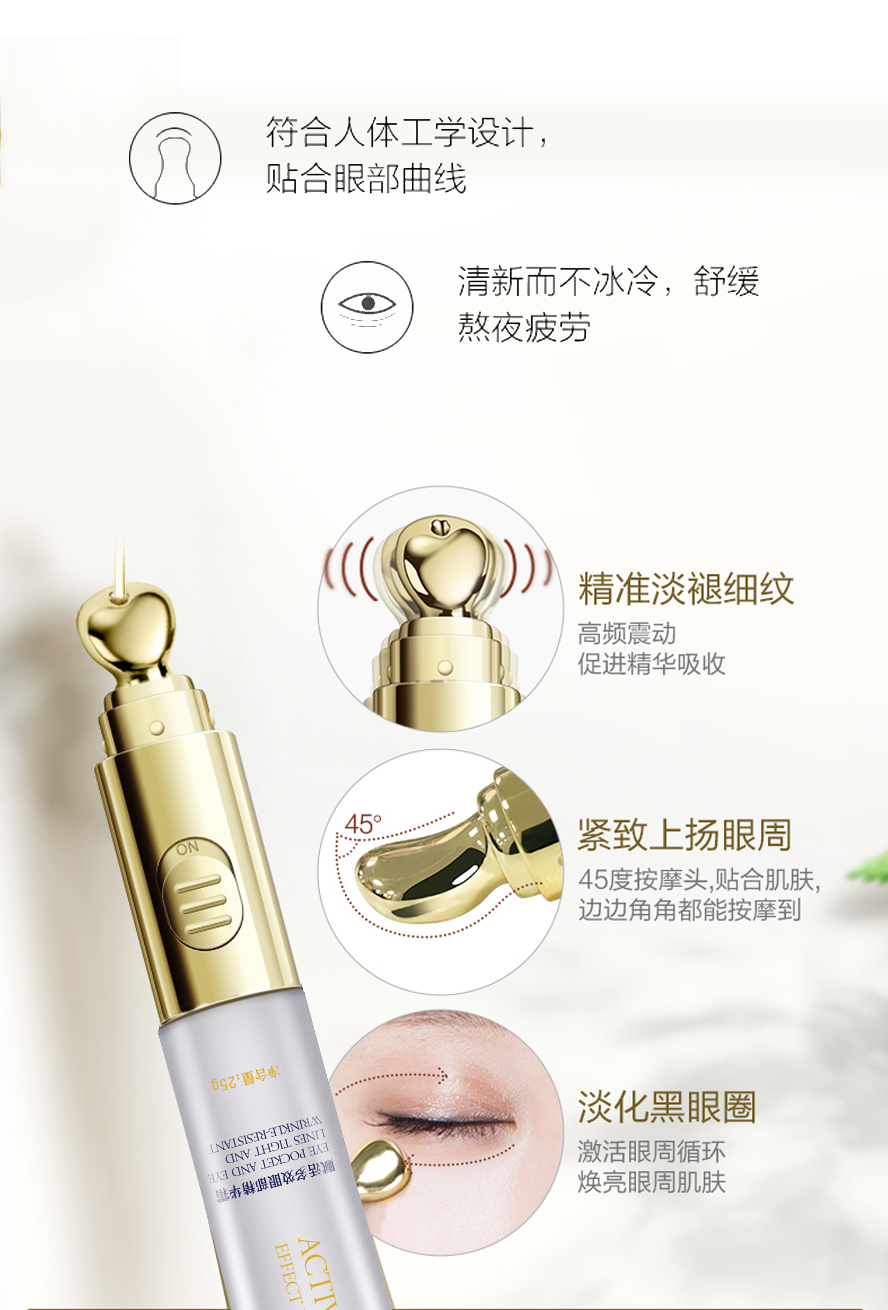 美丽时光赋活多效眼部精华电动眼霜蕴含多种营养成分,配合六肽-1、咖啡因、光果甘草、甜菜碱、北美金缕梅、木糖醇、透明质酸钠等有效提取物,能有效渗入眼部肌肤,舒缓干燥肌肤,改善眼部肌肤粗糙暗沉,淡化眼周细纹,改善眼纹眼袋,补充眼部肌肤缺失的营养与水分,使眼部肌肤紧致靓丽。