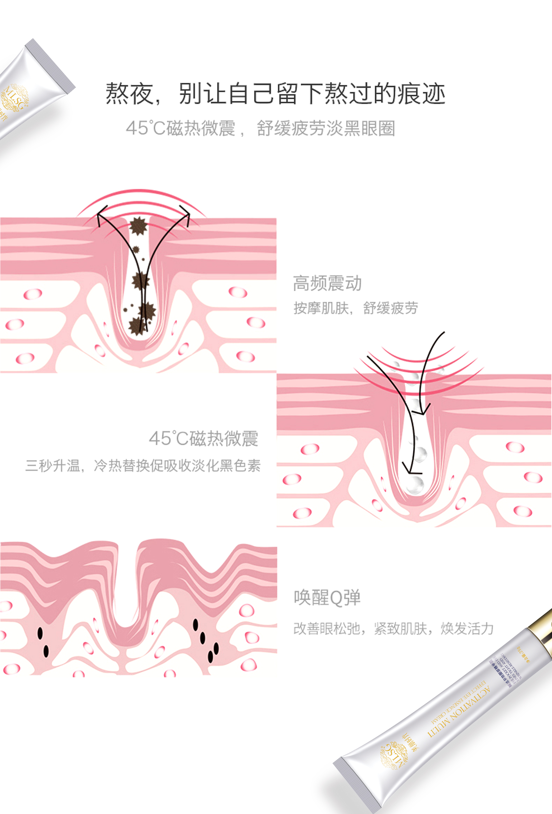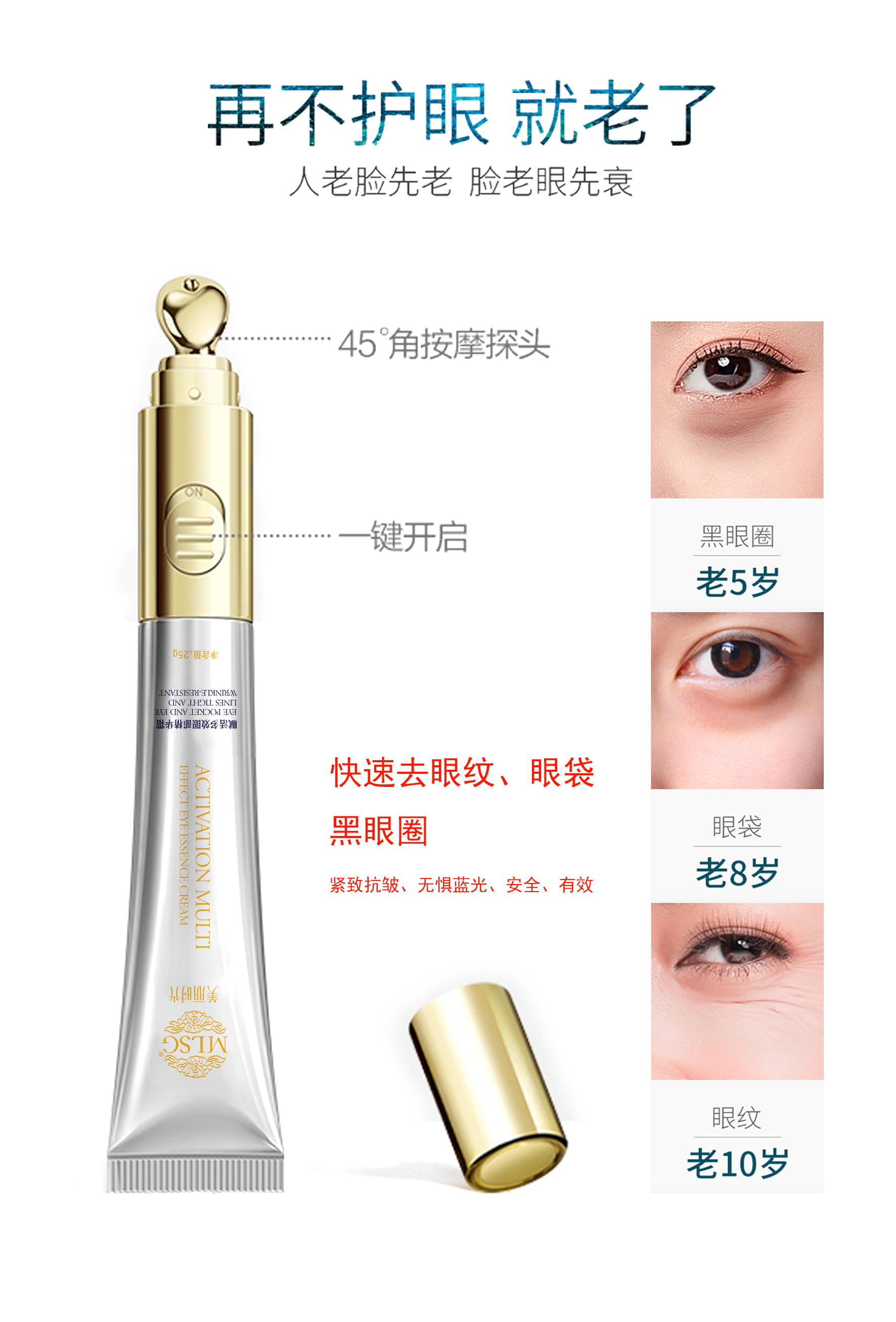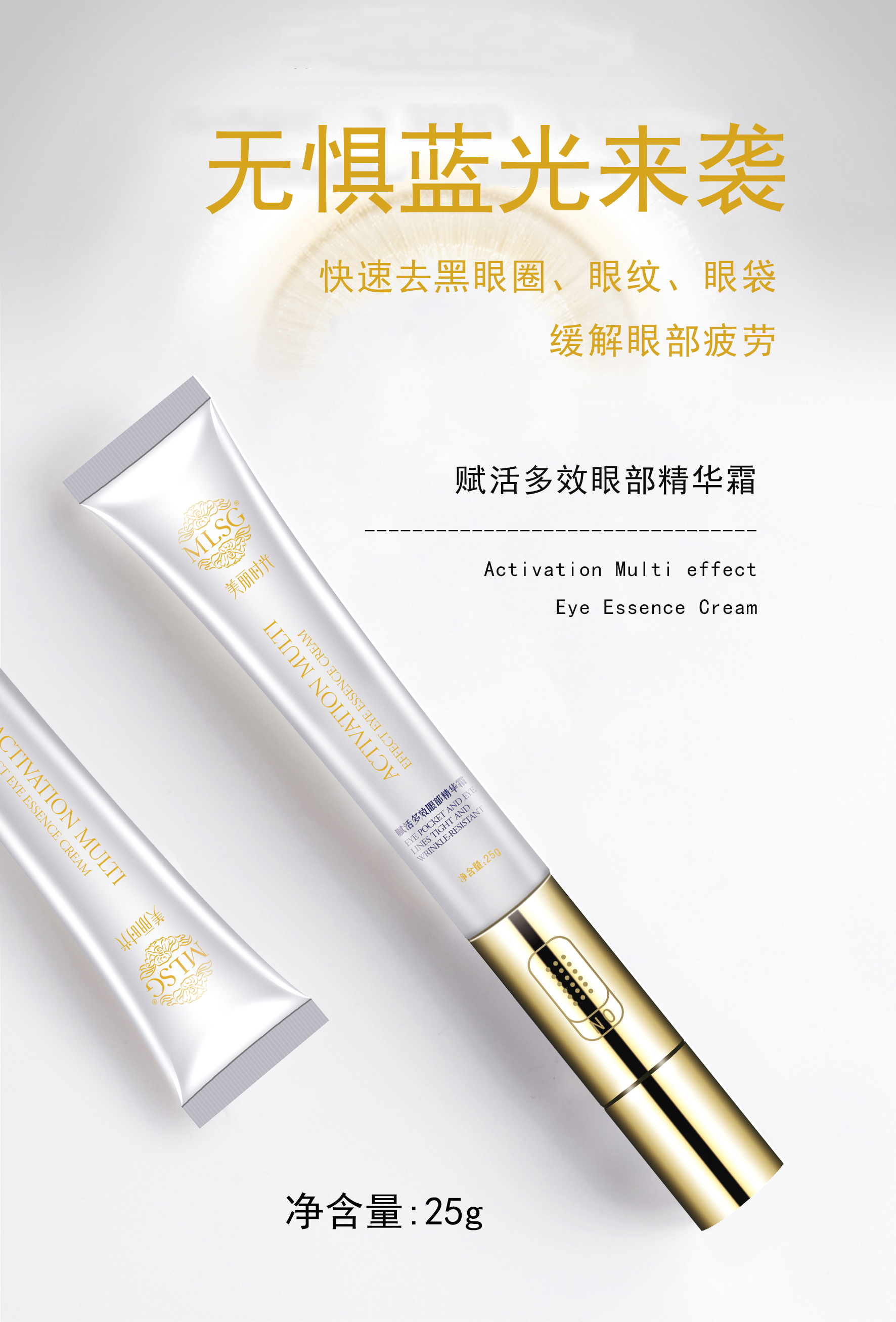 使用方法:洁面爽肤后,取适量本品轻揉涂抹于眼部肌肤,用眼霜按摩头轻揉眼周轮廓按摩致肌肤吸收即可。