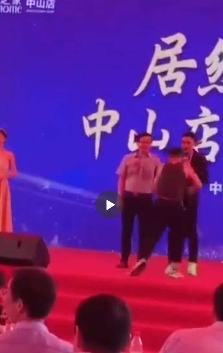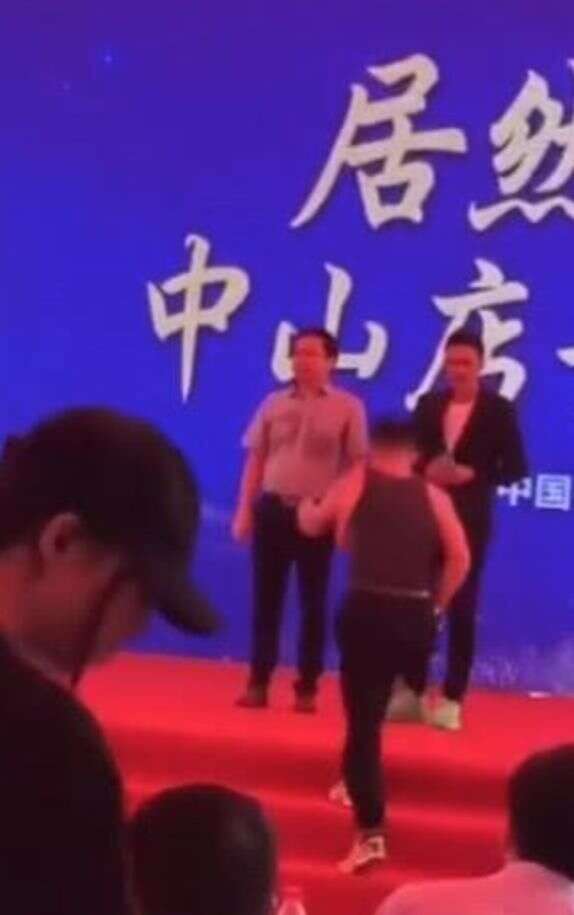 当时主持人正在报幕,应该是让现场的领导嘉宾上台合影留念,结果第一个领导上台后,后面紧跟了一个穿着背心的中年男子。