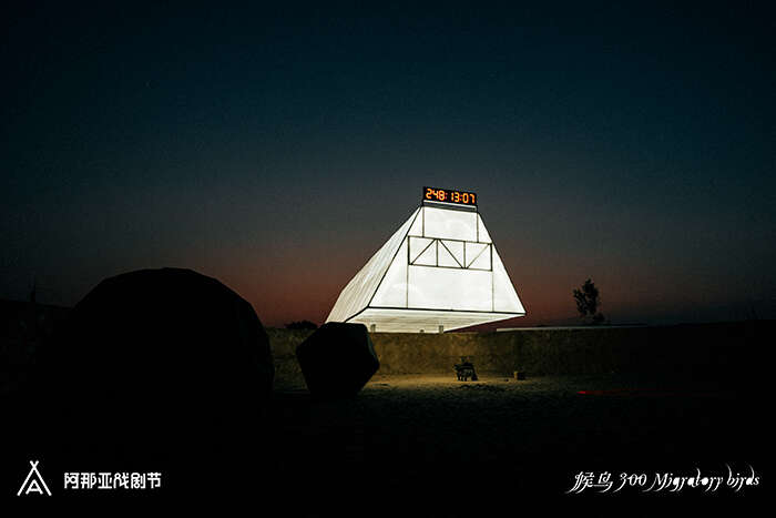 作为戏剧节重要艺术单元——候鸟300在2023年6月12日启幕,这是一场来自世界各地300位艺术家131组作品,194场演出的大型公共艺术活动,全部集中在阿那亚孤独图书馆向北200米的海滩上。据孟京辉工作室宣传总监,阿那亚戏剧节的宣传顾问王好介绍,候鸟300最早概念来自于孟京辉团队前往法国阿维尼翁参加戏剧节的经验。当时他们住在一片帐篷营地里,来自各国的戏剧爱好者、创作者在这片营地相互交流,气氛火热,因此也引发了他们的无限遐想——在这样的环境里会生长出什么样的作品呢?从2021年开始,“候鸟300”就在海滩上举办。2022年,著名建筑师马岩松为“候鸟300”设计了候鸟沙城——一座沙滩上艺术乌托邦之城,今年马岩松再次打造了全新的候鸟沙城。