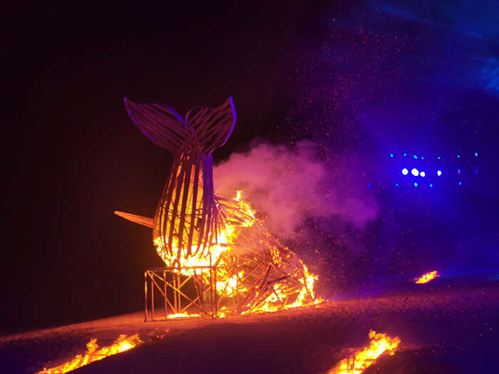 6月17日晚,参加阿那亚戏剧节的艺术家从阿那亚四期小镇广场出发,艺术家、花车组成的巡游队伍在观众簇拥中沿着阿那亚社区街道,载歌载舞,一直巡游到海边沙滩。在众人围观注视中,海滩上巨大美丽的“鲸鱼”在大火中熊熊燃烧,艺术家和游客们在沙滩上点燃起了篝火,巡游狂欢持续到深夜。