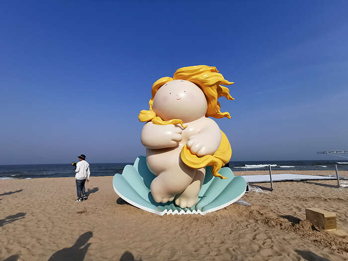 艺术家大橘子的作品《维纳斯的诞生》是大艺术家系列中的一个人物,取材于波提切利的名画,作品依托这幅世界名画以可爱的方式来到我们的生活中。将雕塑和真实的大海结合在一起,创造一个更加有趣可爱的场景。