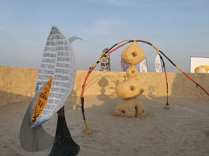 候鸟300所在的海滩,远方为作品“海上鸟帆”(摄影:刘鹏飞)