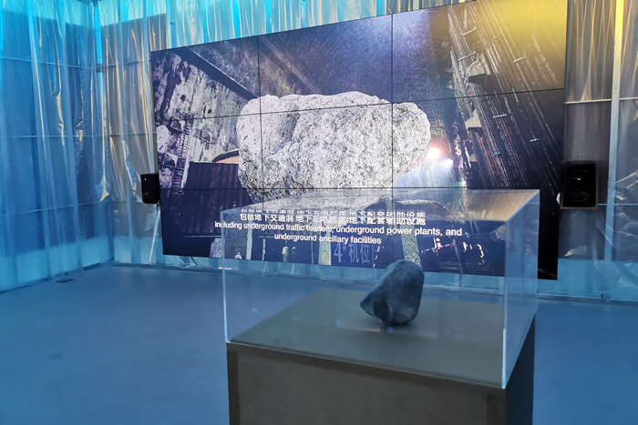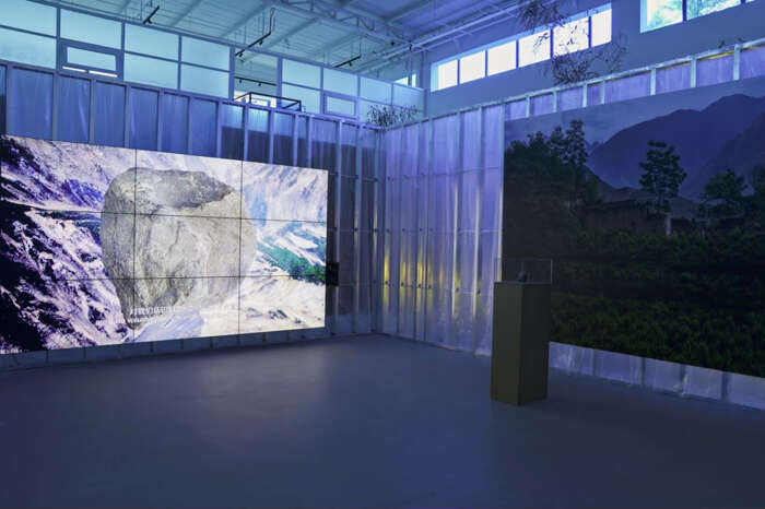 我们就从这一相似点出发,我们找到了蛇纹绿岩这一概念。在发现蛇纹绿岩之前,人类认为地球随着时间会不断塌缩而产生褶皱,形成山脉和海沟,由此人类对山脉的理解是断裂,山脉和海沟两侧的生态与景观,人类的语言和文化通常壁垒分明。发现蛇纹绿岩之后,人类的认知更新为地球板块之间的碰撞是一种缝合的状态,从“缝合”这一视角出发,地球上自然与文化的差异自然就不是隔阂,而是交流和连接的起点。我们的展览理念就基于蛇纹绿岩这种石头生发的思考,从断裂走向缝合。”