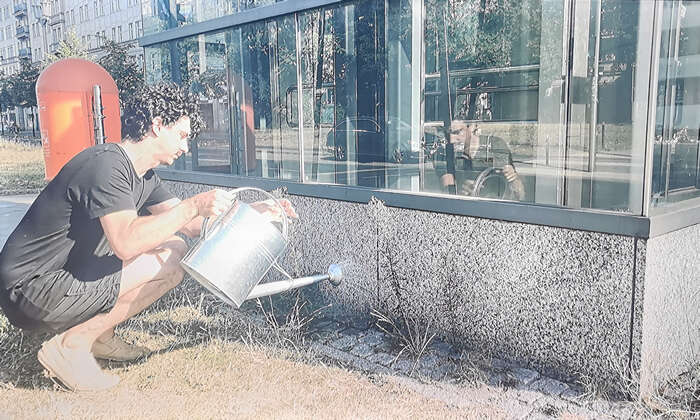 艺术家为杂草浇水降温(图片:“Adrien Missika”影像截图摄影:刘鹏飞)