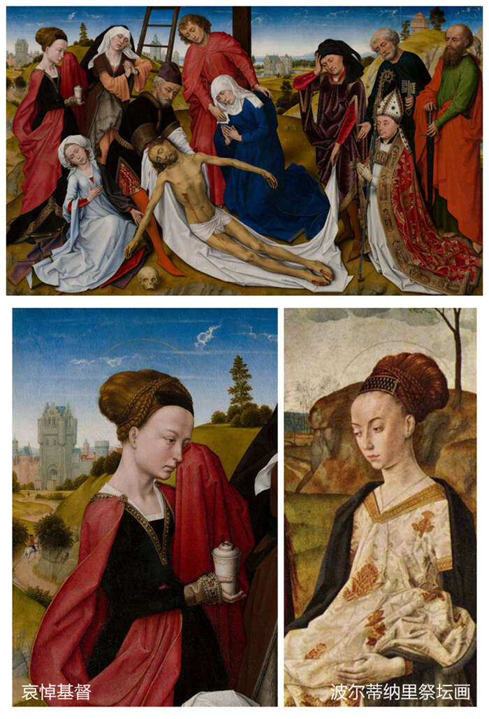 上图:“哀悼基督”(Lamentation of Christ),罗希尔·范德魏登或其追随者,约1460/70,荷兰海牙莫瑞泰斯皇家美术馆(The Hague,Mauritshuis);左下:“《哀悼基督》中的抹大拉的玛利亚”,推测为雨果•凡•德•古斯所作,约1450,柏林画廊藏品;右下*:“《波尔蒂纳里祭坛画》中的抹大拉的玛利亚”(Portinari-Altar:Detail der Maria Magdalena),雨果•凡•德•古斯,约1476/77-1480,乌菲齐美术馆