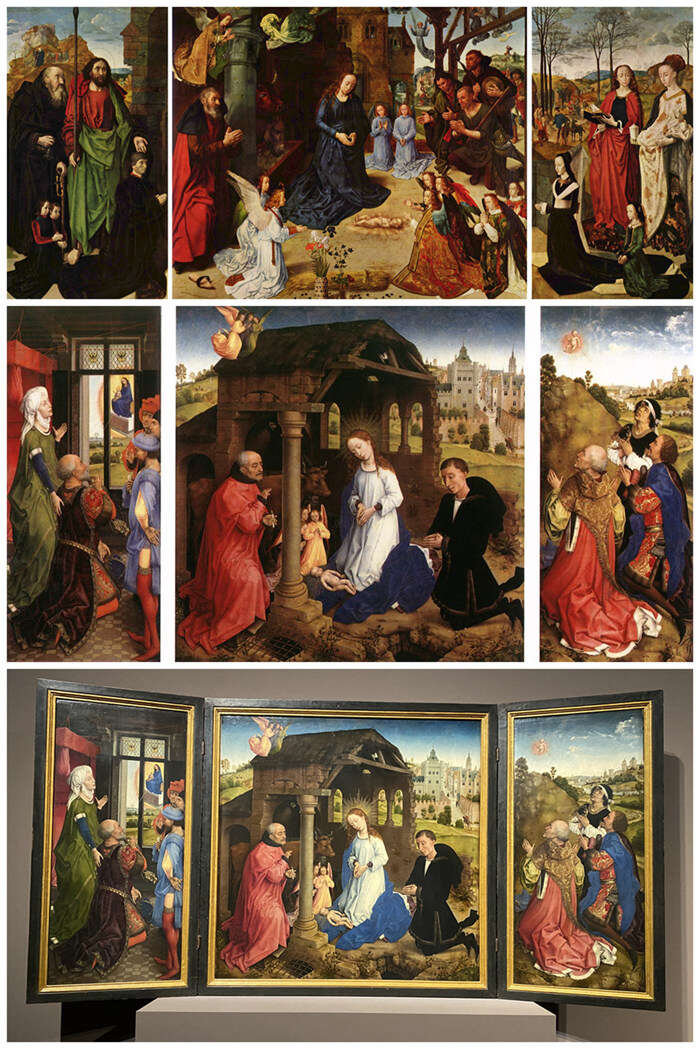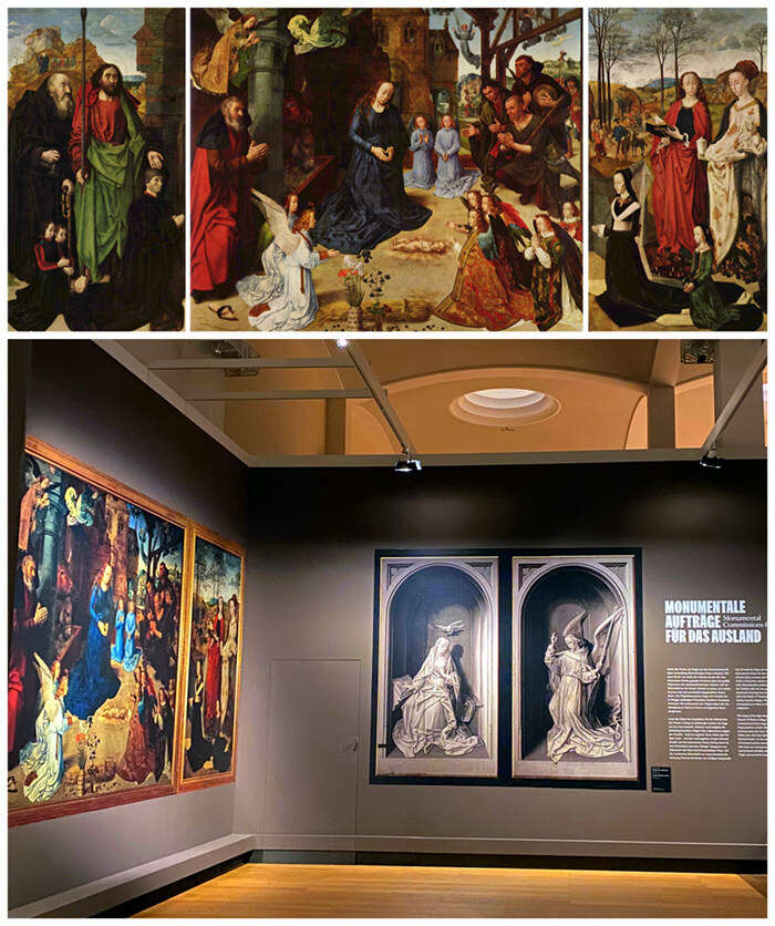 上图*:“波尔蒂纳里祭坛画”,雨果•凡•德•古斯,约1476/77-1480,乌菲齐美术馆;中图:“米德尔堡祭坛画”(Middelburger Altar / Bladelin-Altar),罗希尔·范德魏登(Rogier van der Weyden,约1399/1400-1464),约1450,柏林画廊藏品;下图:柏林展览现场实拍图