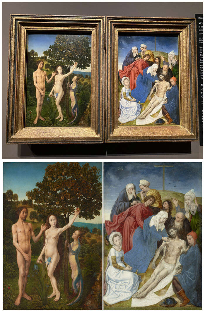 “维也纳双联画”(Vienna Diptych),雨果·凡·德·古斯,约1477/79,奥地利维也纳艺术史博物馆藏品 (Kunsthistorisches Museum Wien)。上图:展览现场实拍;左下:“左幅之原罪”(Fall of Man)”;右下:“右幅之哀悼基督”(Lamentation)