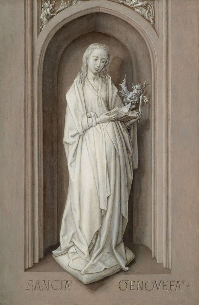 “维也纳双联画左面板背面:圣女热纳维耶芙”(Vienna Diptych:Saint Genevieve),雨果•凡•德•古斯,约1477/79,奥地利维也纳艺术史博物馆藏品