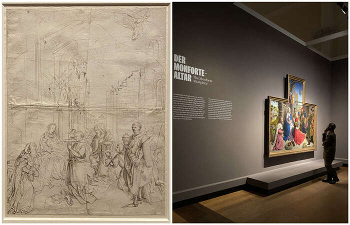 左图:“蒙福特祭坛画素描复制”,尼德兰艺术家,约1490/1500,瑞典国立博物馆藏品(Stockholm,Nationalmuseum);右图:展览现场的蒙福特祭坛画