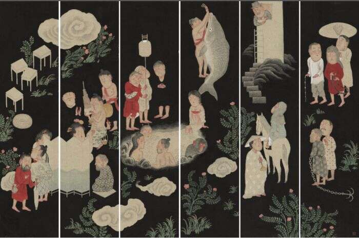 代英伦 人群,章回绣像本的寻访 纸本设色 138×204cm