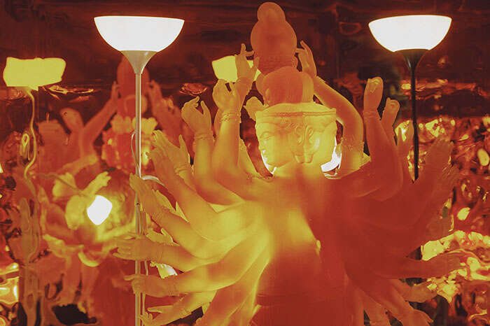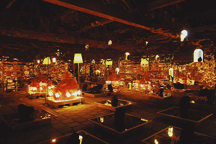 “你可以看到展厅里的两尊琉璃佛像周围有很多盏灯,这些灯其实就是万家灯火,它们不是新的灯,是我从不同地方收来的,它们曾经照亮过不同的家庭。放在这个空间以后,变成了这个空间里唯一的照明。我想我们每个人都是这个世界的光明。”宋冬补充道。