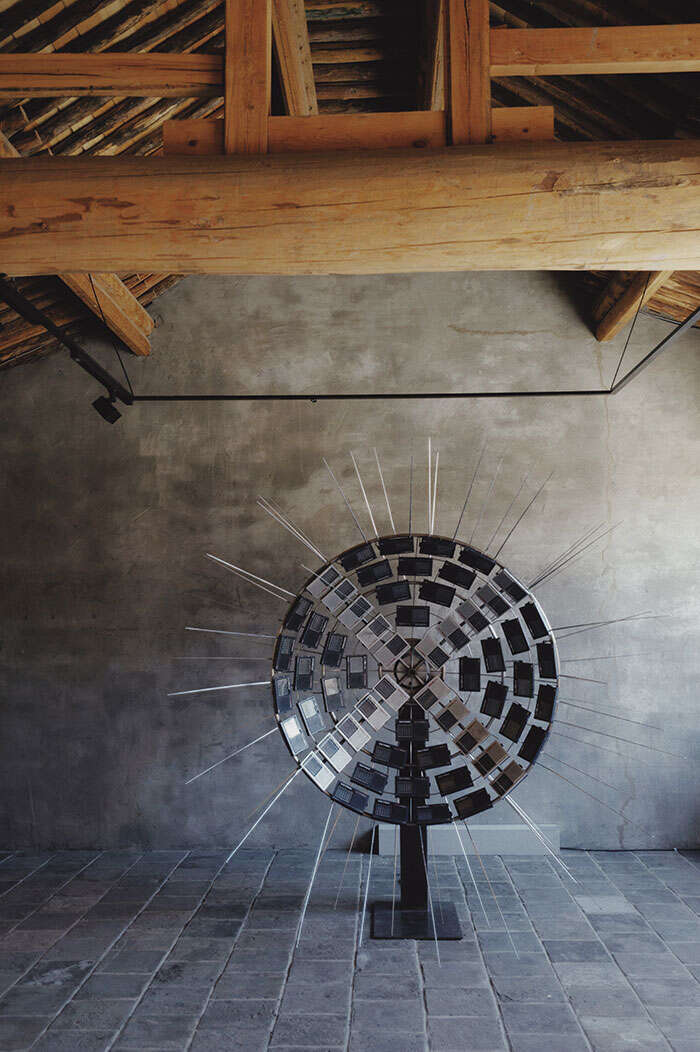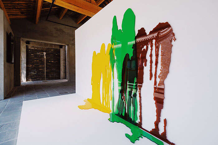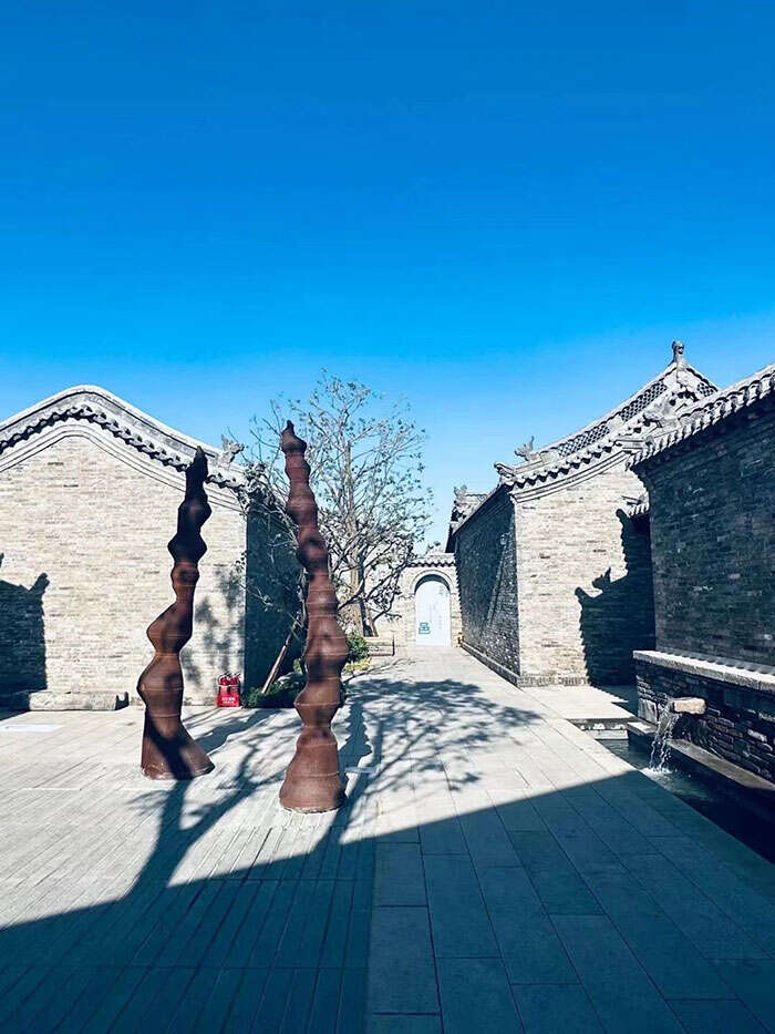 此次“寻邑”之旅,如果只顾着在展厅内寻找作品,你可能会错过不少惊喜。在一座院子的大树下,沈烈毅作品《雨》与建筑外墙上的树影斑驳相映成趣,在炎炎夏日为视觉送来一抹凉意。“我是杭州人,也许是江南水乡潜移默化的一些审美影响,一直视水为师,始终在向水学习。我希望通过技术手段达到无限接近水的那种自然的状态。之所以选择在石头的表面去塑造水的自然形态,主要源于对中国园林和空间美学的一些理解。不需要喧哗的色彩,在黑色的石面上,好似有微风吹过,掀起水面的一点涟漪。最简单的形态,最简约的色彩便可以表达丰富的意蕴和情绪。”沈烈毅说道。