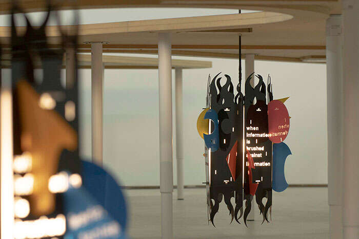 在主单元展厅,艺术家宋冬受本次展览委托创作了作品《不知我知》。展厅建筑外立面上方悬挂着宋冬手书的“不知我知”四字牌匾,而在展厅内部,以煤炭、石窟、琉璃佛像、镜面、电灯等元素为媒介,宋冬创造了一个虚幻的有关佛像寺庙的精神空间,也为大同寻找到作为佛都与煤都、文化本源与当代生活之间的某种精神关联。“‘不知我知’四个字可以从左往右念,也可以从右往左念,念诵时标点断在不同的字后便产生不同的意义。你可以念为‘不知我知’,也可以念为‘知我不知’,它是多重含义的。像苏格拉底说的,我知道我不知道。这是最可贵的。”宋冬说道。