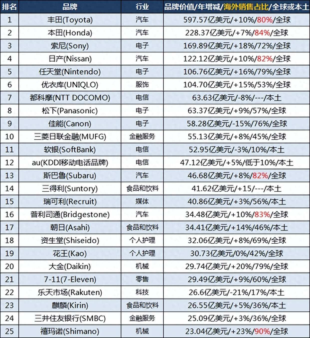 汽车和电子产业是日本的优势产业,技术先进规模庞大,也是日本最具品牌影响力的两大产业,包揽了榜单前五,丰田、本田两大汽车品牌排名前二,其中丰田品牌价值597.57亿美元排名榜首遥遥领先,丰田的海外销售收入占比为80%,本田的海外销售收入占比则为84%。
