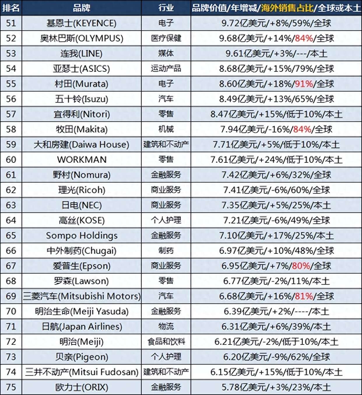 基恩士(KEYENCE)排名第51位,奥林巴斯(OLYMPUS)排名第52位,连我(LINE)排名第53位;