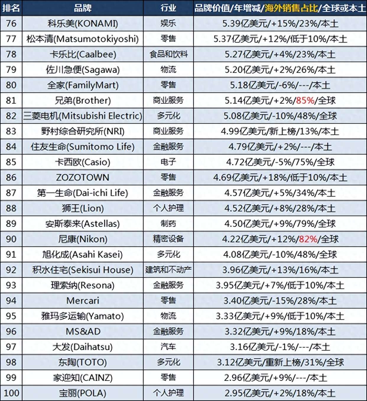 贝亲(Pigeon)排名第73位,三井不动产排名第74位,欧力士(ORIX)排名第75位;