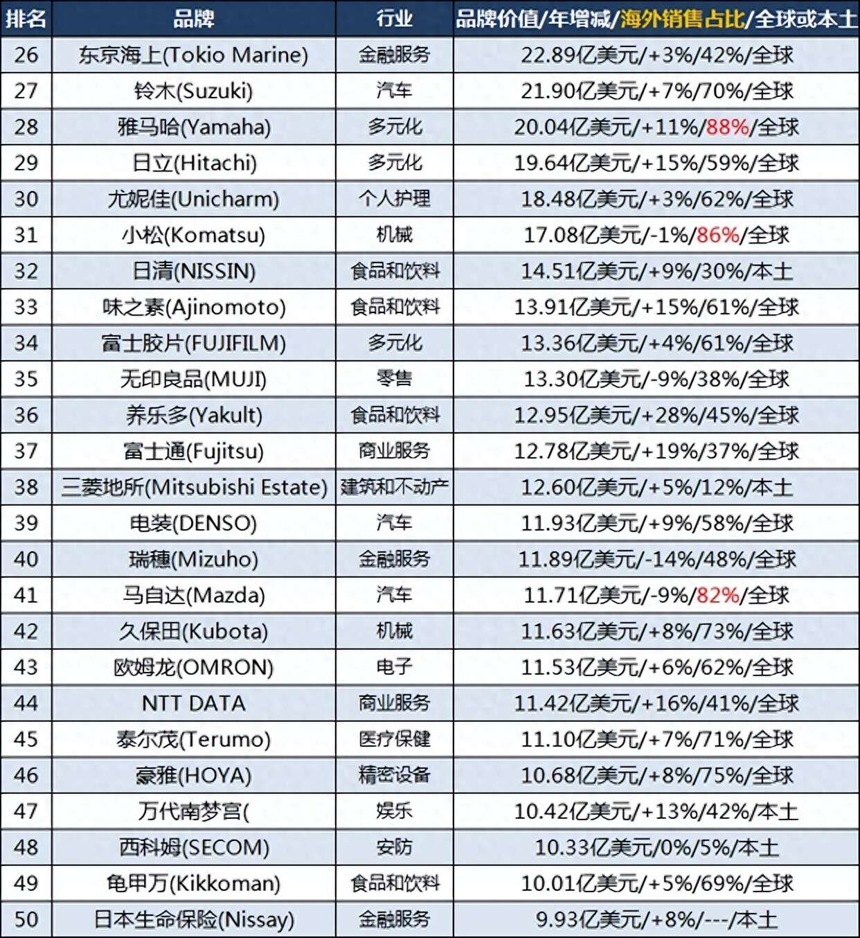 东京海上排名第26位,铃木(Suzuki)排名第27位,雅马哈(Yamaha)排名第28位;
