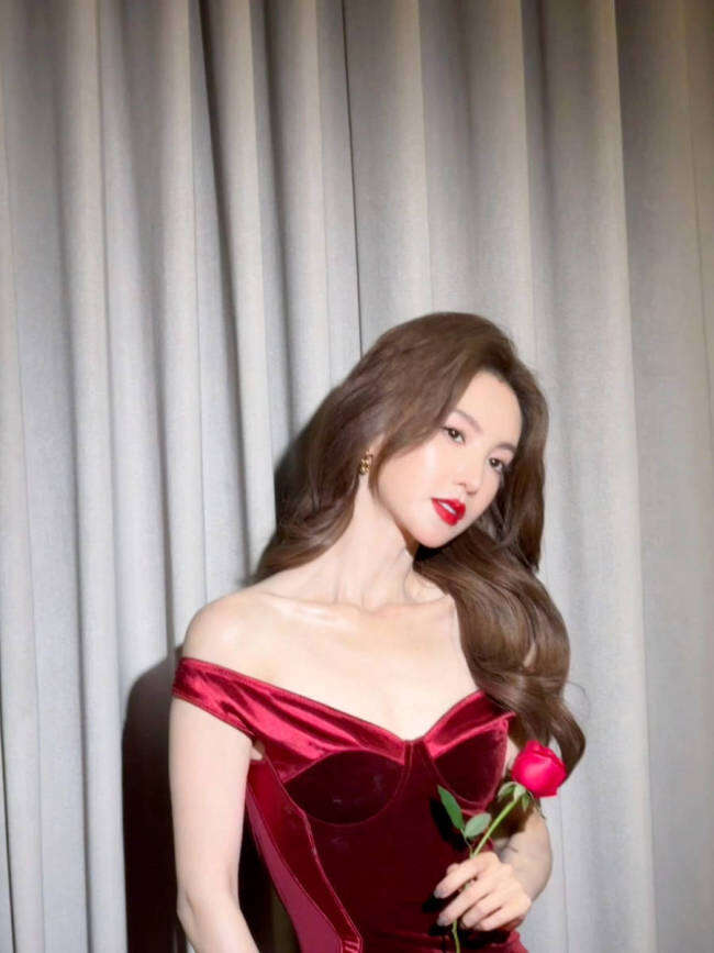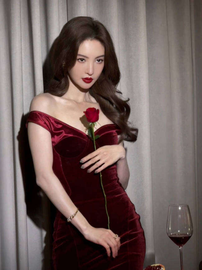 标题:金晨着酒红色礼服小露香肩 大波浪卷发性感又优雅