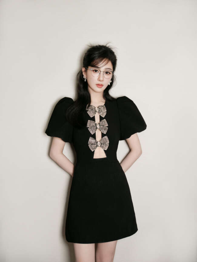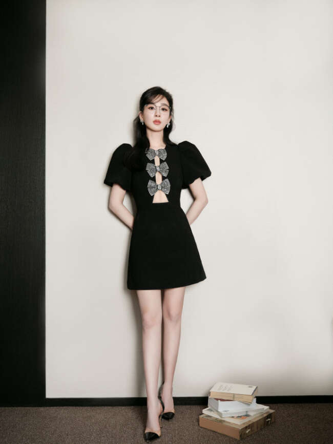 标题:杨紫黑色镂空蝴蝶结短裙造型温柔典雅