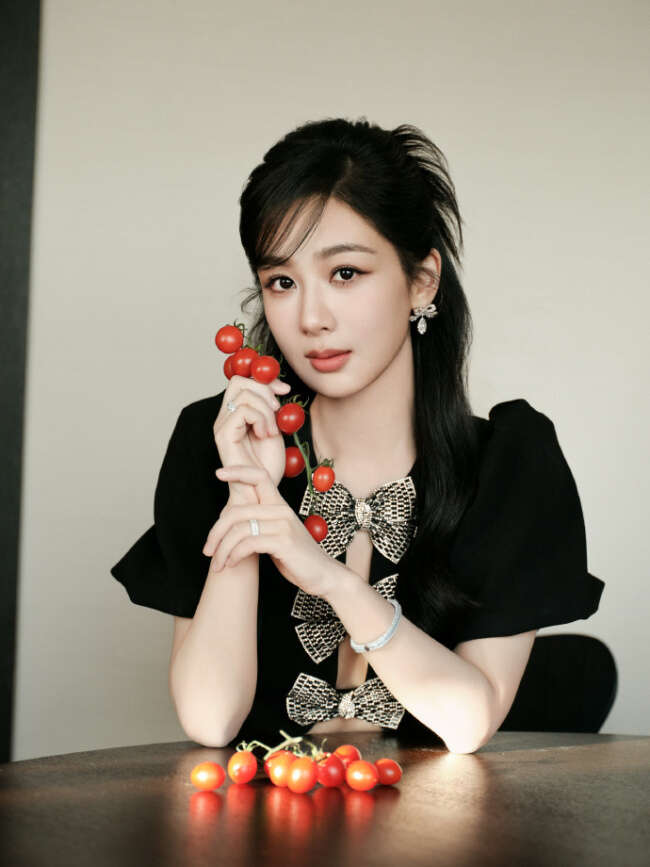11月22日,工作室发布一组杨紫的写真大片。杨紫身穿黑色镂空蝴蝶结短裙,温柔大方。杨紫斜刘海配黑框眼镜,知性又复古。