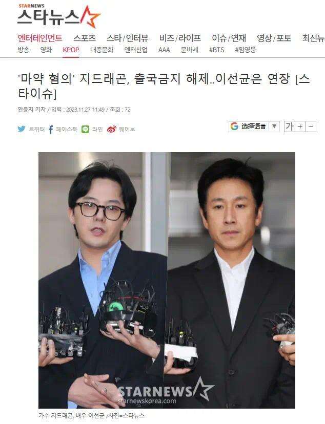 11月27日,据韩媒报道,此前被列入涉嫌吸毒调查对象的权志龙,韩警方时隔一个月解除了他的出国禁令。但对同样立案调查中的演员李善均,韩警方则申请了他的延长出国禁令。根据韩国出入境管理法,如果认为嫌疑方为了调查而不适合出国,可以以1个月为单位申请禁止嫌疑方出境。韩警方对于尚未结束调查的权志龙,在解除禁止出国的同时,却延长了对李善均的禁令,因此有预测称,韩警方对两人的调查方向持有不同的看法。