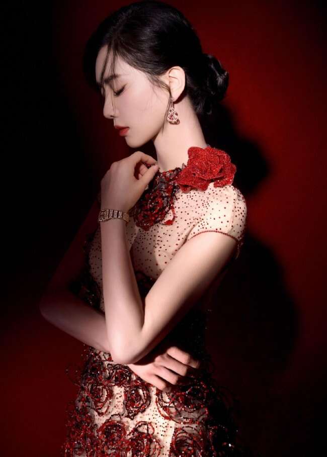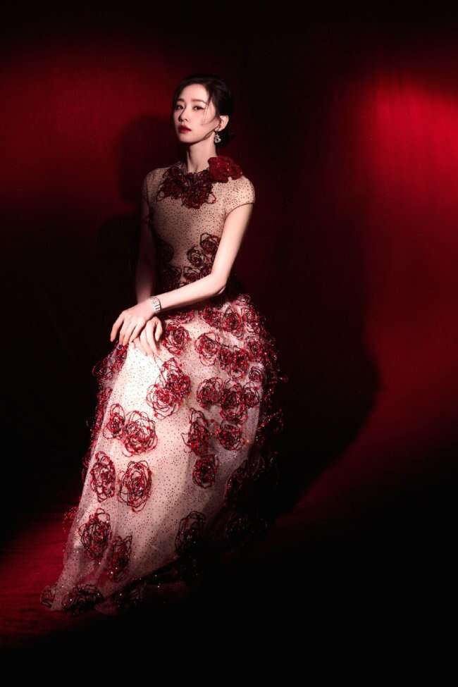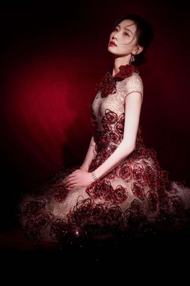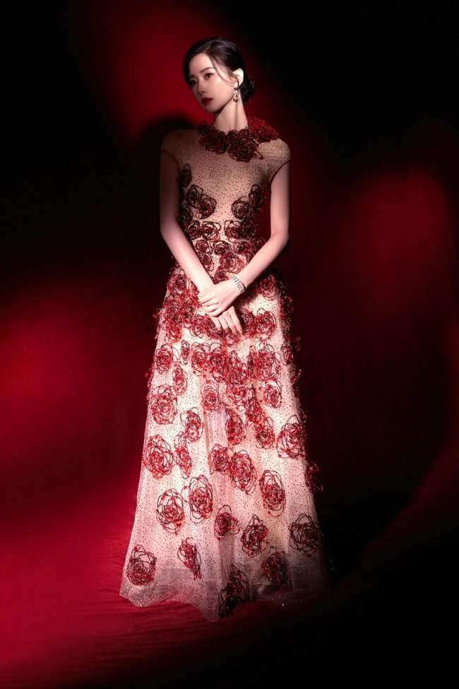 标题:刘诗诗身穿长裙红玫瑰点缀 举止温柔优雅热烈惊艳