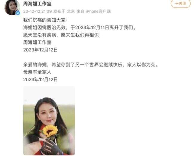 周海媚工作室发文,称周海媚因医治无效离世来自@周海媚工作室微博