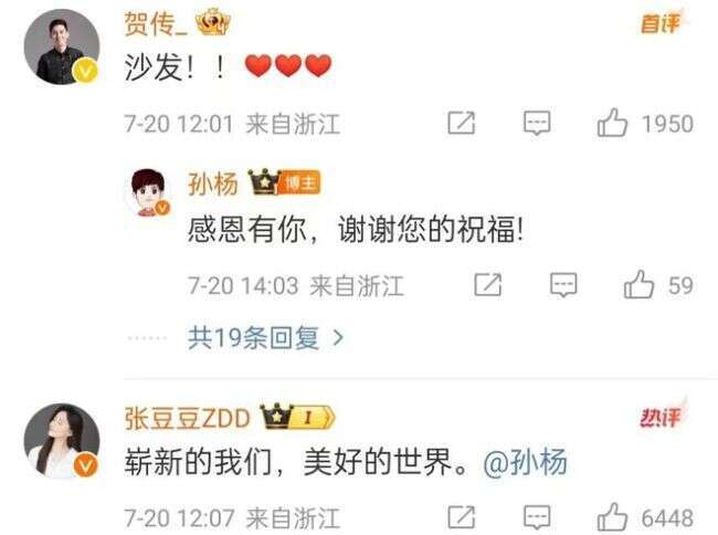 他官宣后,主持人贺传第一时间恭喜,张豆豆回应,“崭新的我们,美好的世界”,秀了一波恩爱。