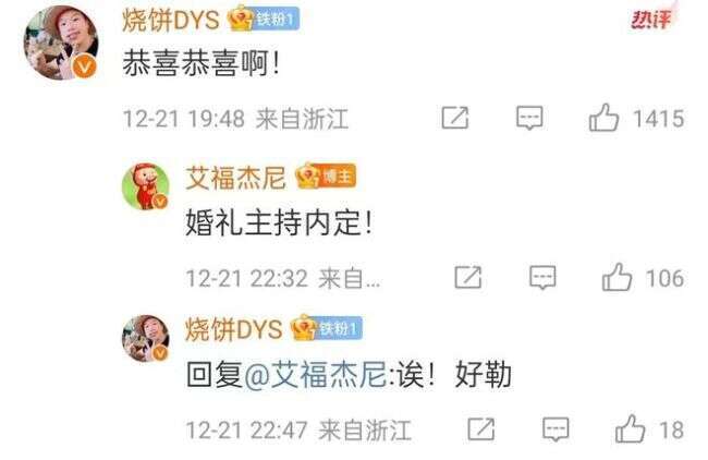 艾福杰尼官宣后不久,火速登上热搜,网友们一片祝福。朱云峰(烧饼)、派克特、邓超元等明星好友,也都发来祝福。