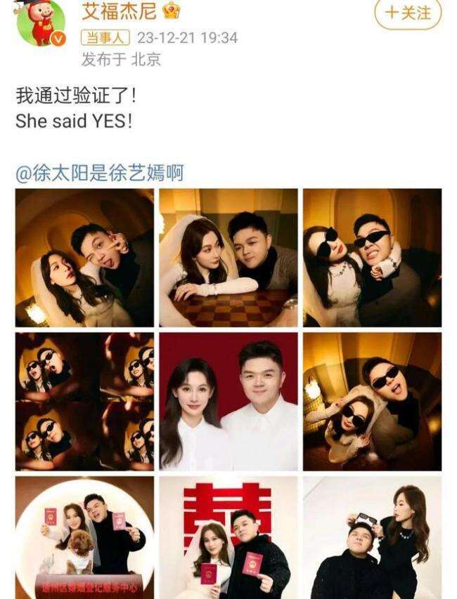 据悉,早在去年8月,艾福杰尼与徐艺嫣的恋情被曝光,今年10月两人晒合照官宣恋情,如今终于喜结连理,恭喜恭喜。