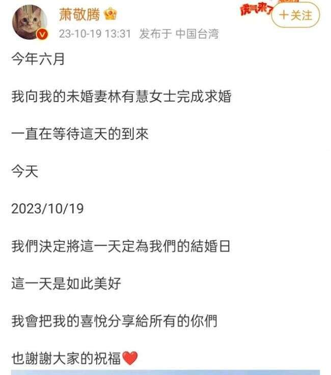 在2023年的10月19日,萧敬腾发文官宣结婚,表示这一天是他和林有慧的结婚日,并透露在今年六月,他就求婚成功了。