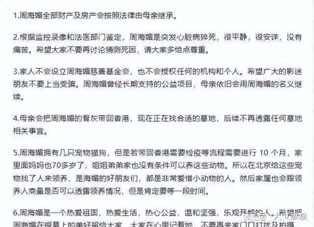 周海媚去世后,她的财产都由母亲继承,据了解她的母亲会将她的骨灰带回香港,目前正在找合适的墓地,不过他们家不会公开墓地的位置,因为他们不想周海媚受到打扰。