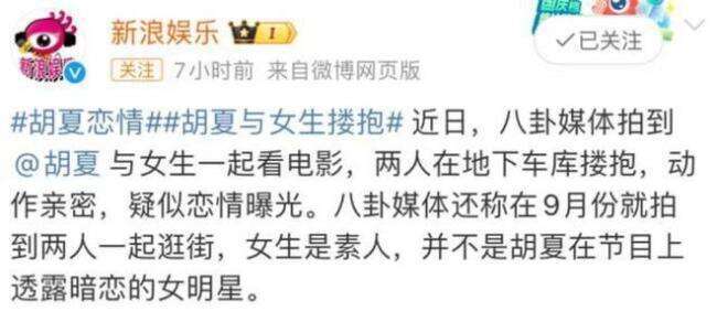 另一个八卦媒体还表示,2023年9月份的时候,就曾拍到胡夏与该女生一起逛街,女生只是素人,并非他在节目中公开讲的女明星。