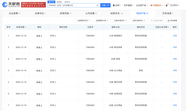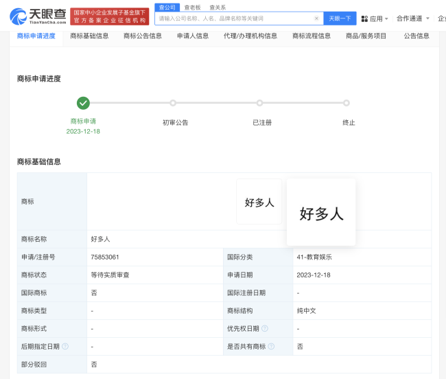 天眼查App显示,近日,东申未来(北京)文化有限公司申请注册多枚“好多人”商标,国际分类包括教育娱乐、珠宝钟表、日化用品等,当前商标状态为等待实质审查。