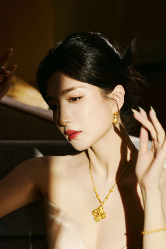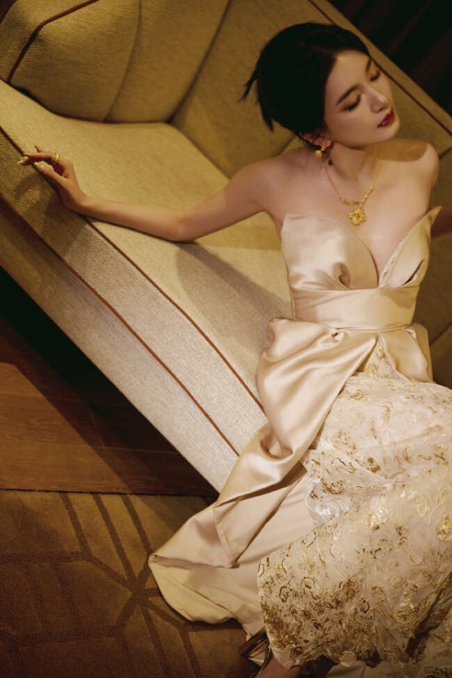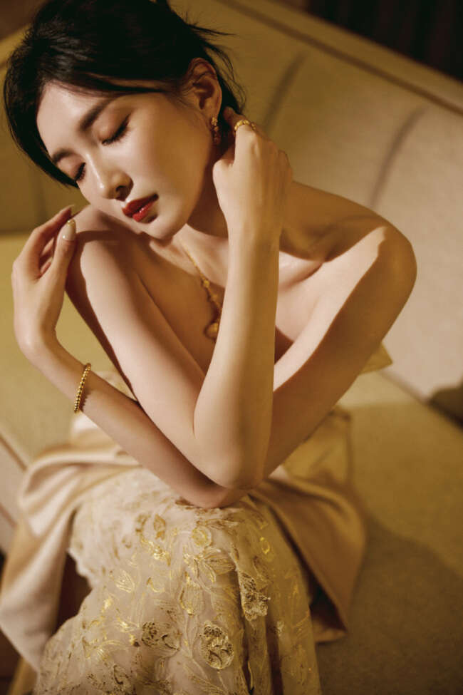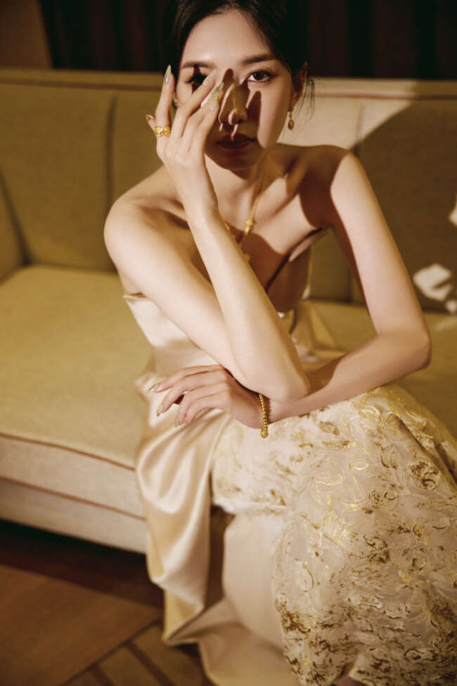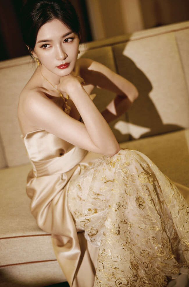 江疏影身穿金色丝质地长裙,优雅高贵,延续冬日浪漫。