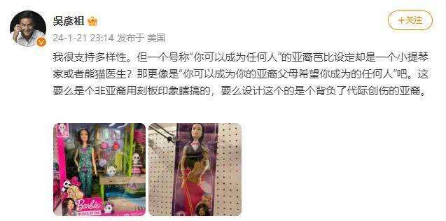 1月21日,吴彦祖在社交平台发文,批判自己在商场中看到的两款亚裔芭比娃娃。