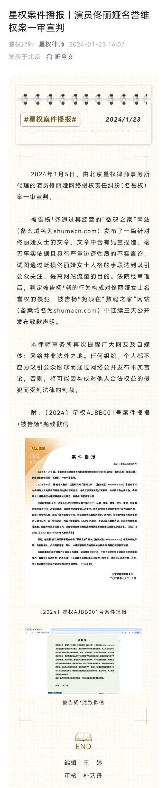 标题:佟丽娅名誉维权案一审宣判!被告网友发布道歉信