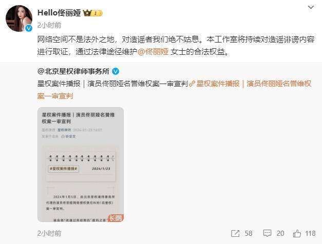 对此,1月23日,佟丽娅工作室转发表示:“网络空间不是法外之地,对造谣者我们绝不姑息。本工作室将持续对造谣诽谤内容进行取证,通过法律途径维护佟丽娅女士的合法权益。”